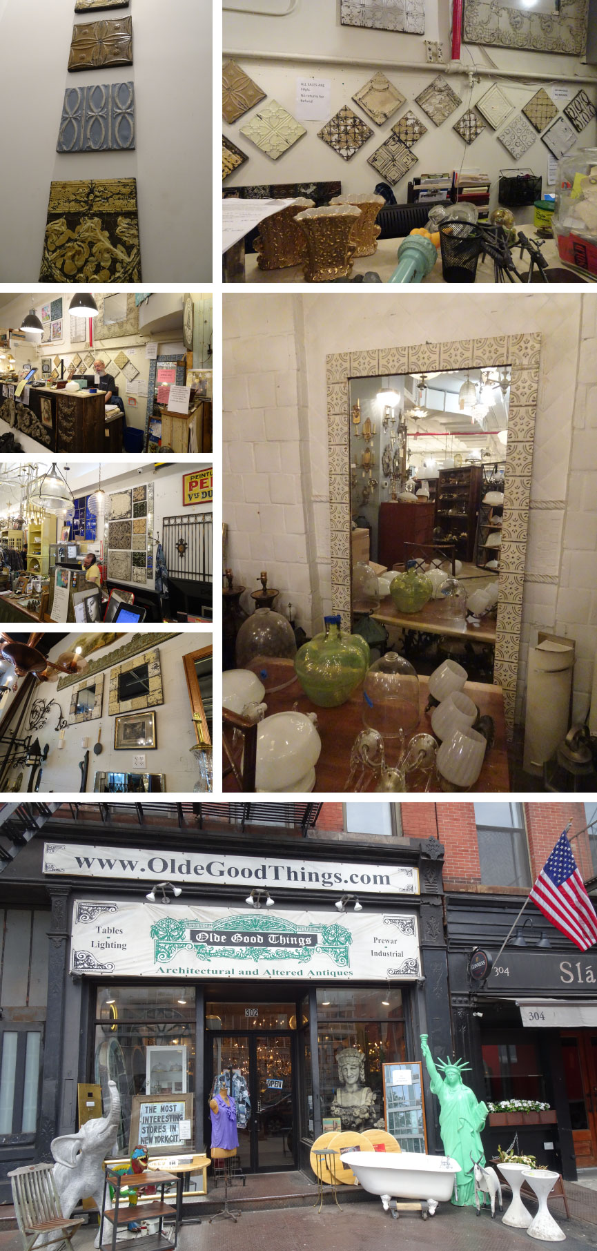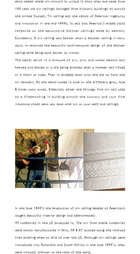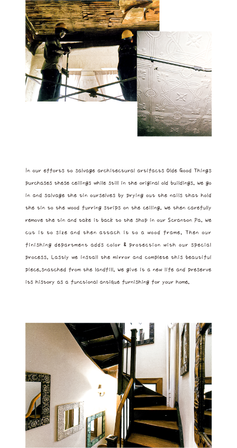 oldegoodthingsは古い建物、文化遺物を探し求めその天井ごと購入し、 ブリキの天井を支える壁から慎重に剥ぎとり、その素材をそれぞれのサイズに合った木製のフレームに取り付け特殊なコーティングを施し、最後に鏡を取り付けることで捨てられるはずの廃材から美しい一品が生まれるのです。